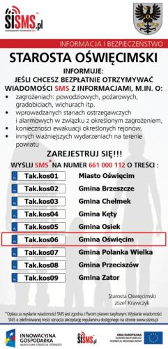 Powiat oświęcimski w trosce o bezpieczeństwo mieszkańców powiatu uruchomił Samorządowy Informator SMS – jest to system przekazywania ostrzeżeń i komunikatów w formie bezpłatnej wiadomości SMS od władz powiatu do wszystkich użytkowników, którzy zalogują się do tego systemu. Otrzymywany SMS będzie zaczynał się od nazwy nadawcy „powiat oświęcimski”. System spełnia wymogi określone w ustawie o ochronie danych osobowych.