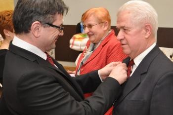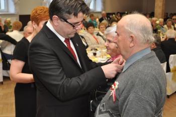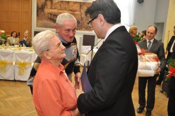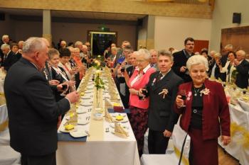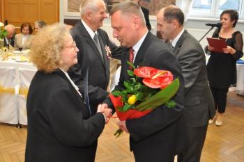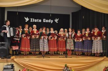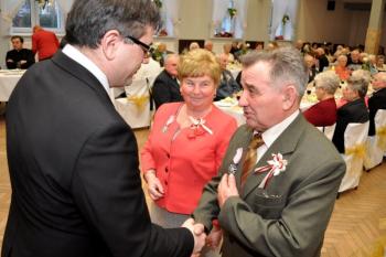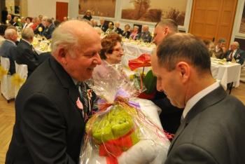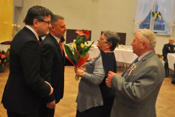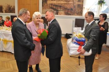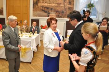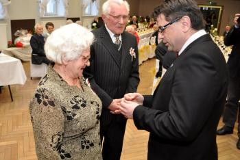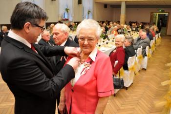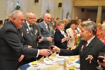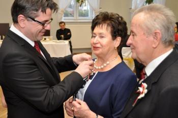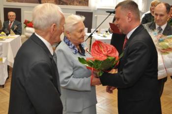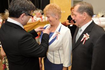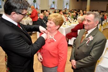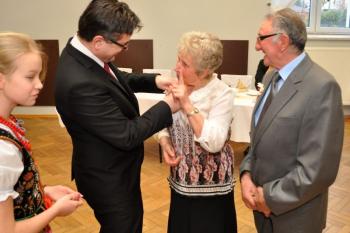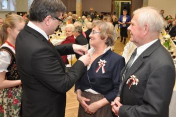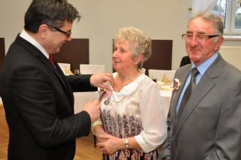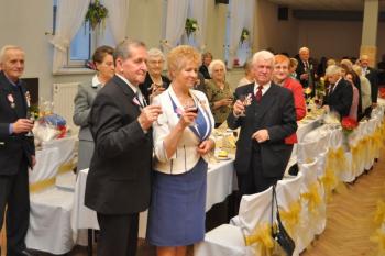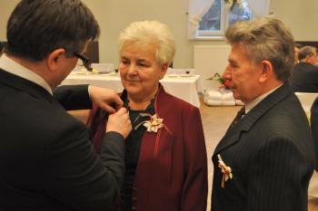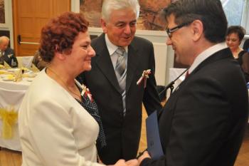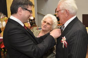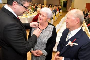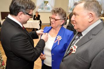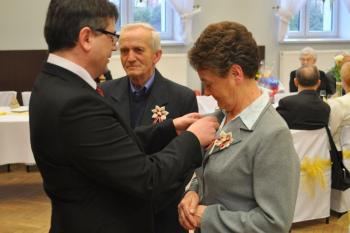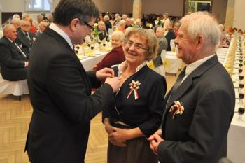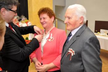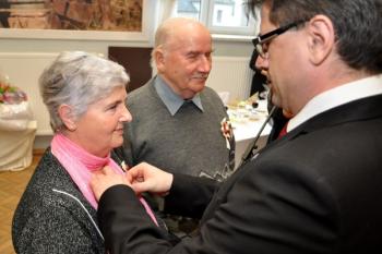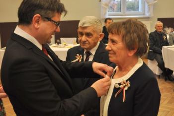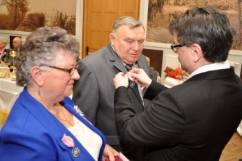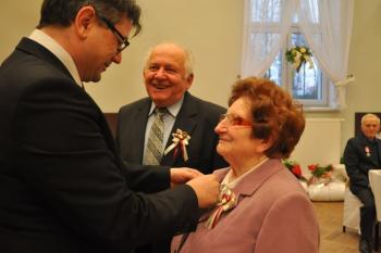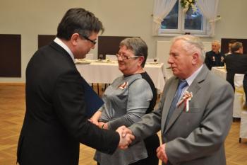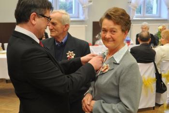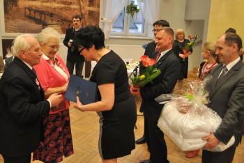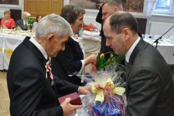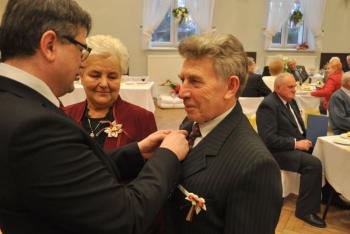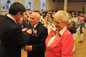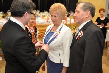 Później, w asyście kierownik USC, udekorował złotych Jubilatów medalami przyznanymi im przez prezydenta RP Bronisława Komorowskiego. Z życzeniami, listami gratulacyjnymi i upominkami pospieszyli przewodniczący rady gminy Piotr Śreniawski i zastępca wójta Mirosław Smolarek. O muzyczną oprawę tej części gali zadbał skrzypek Mirosław Kramarczyk.