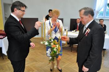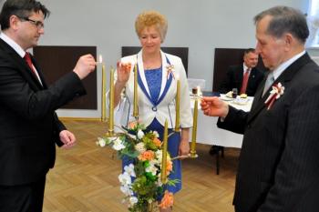O zapalenie świec, których płomień ma magiczne znaczenie, jest symbolem domowego ogniska i trwałości rodziny prowadząca uroczystość Barbara Gasidło poprosiła pp. Łucję i Jana Fabiów z Grojca. W tej ceremonii towarzyszył parze wójt Gminy Oświęcim Albert Bartosz.