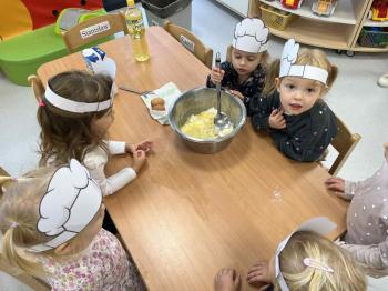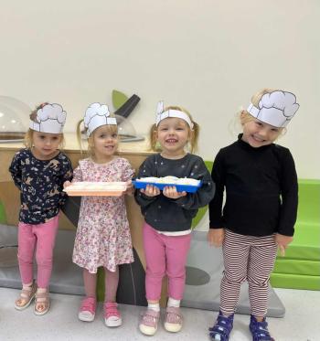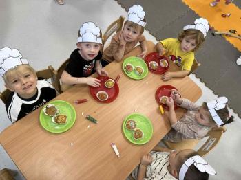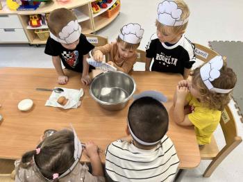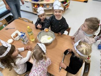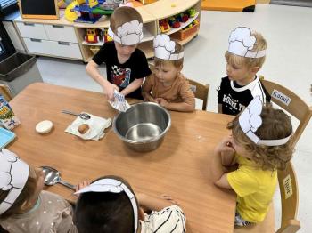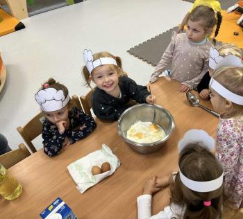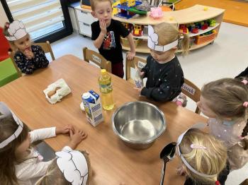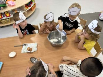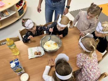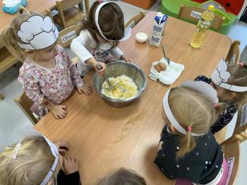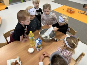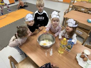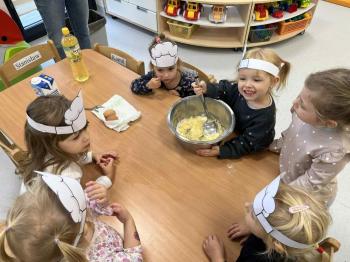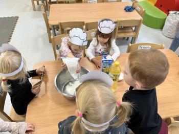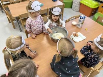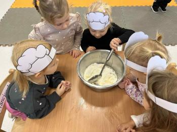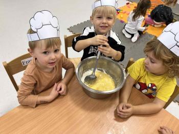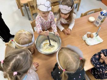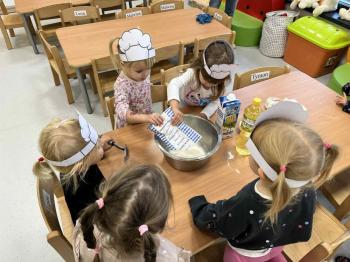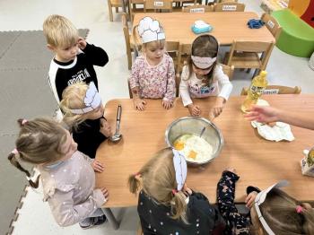 Świętowanie rozpoczęliśmy od wspólnej zabawy i składania życzeń naszym małym dżentelmenom. Następnie cała grupa wzięła udział w kulinarnych warsztatach – dzieci własnoręcznie wyrabiały ciasto na babeczki, ucząc się współpracy i cierpliwości. Po upieczeniu słodkości przyszedł czas na najprzyjemniejszą część – ozdabianie babeczek kolorowymi posypkami i słodkimi dodatkami. Każde dziecko mogło puścić wodze fantazji i stworzyć własną, wyjątkową babeczkę.