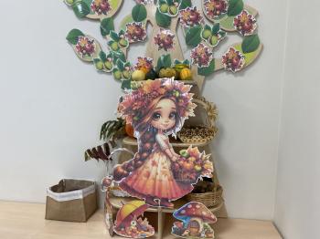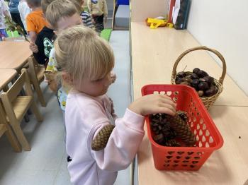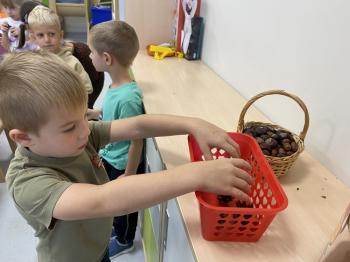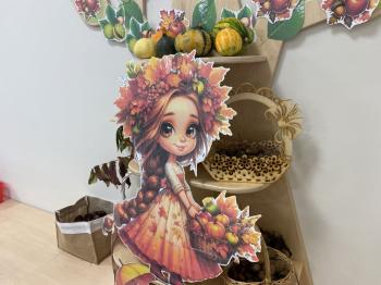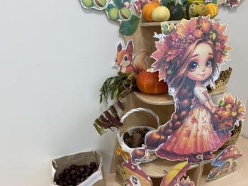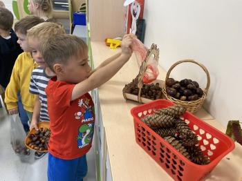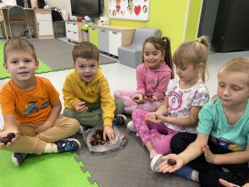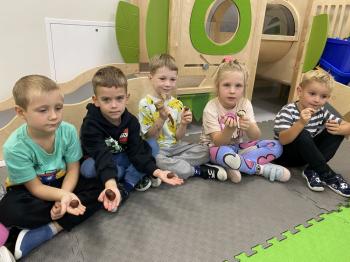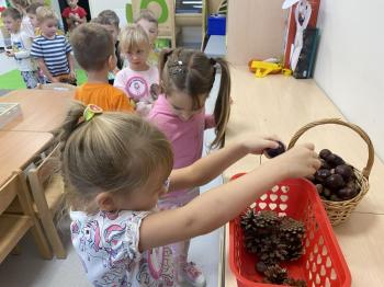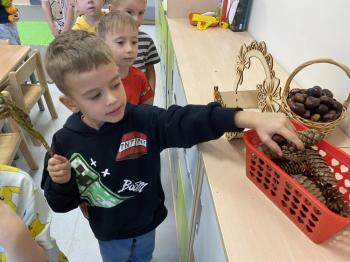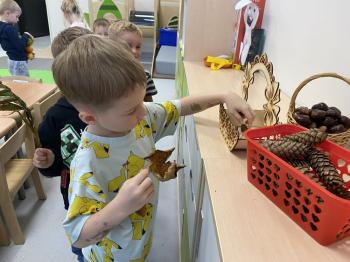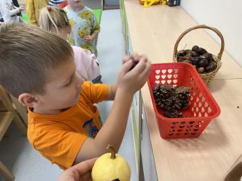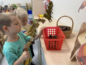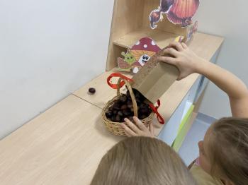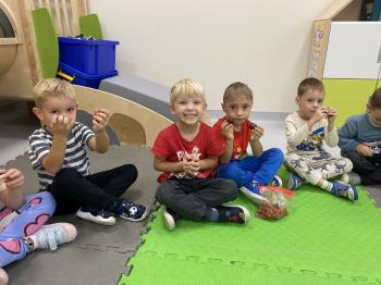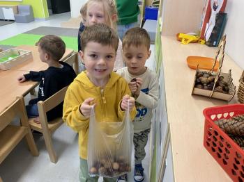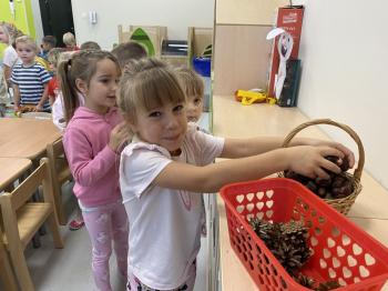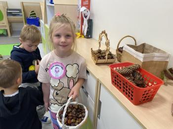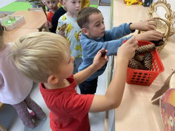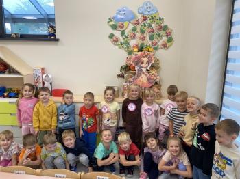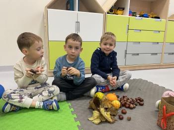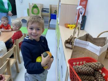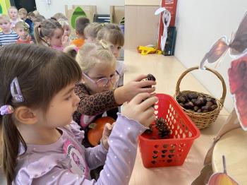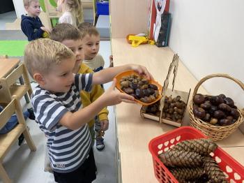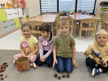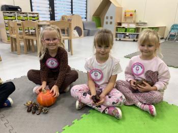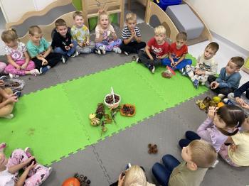 Jeżyki stworzyły swój kącik jesienny. Dzieci przyniosły wiele darów jesieni – dynie, kasztany, żołędzie, liście i orzechy. Prezentowały w kole przyniesione dary, doskonale się przy tym bawiąc.