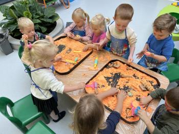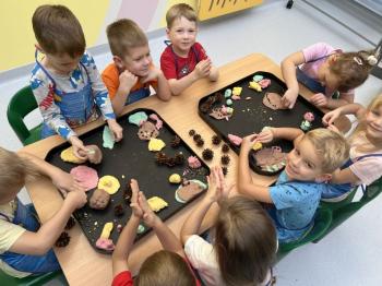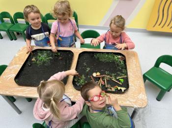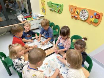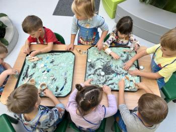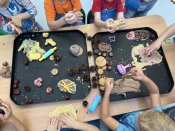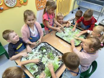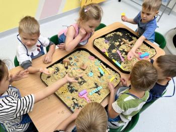 Dzieci odkrywały też „skarby ukryte w piasku”, rozwijając spostrzegawczość i cierpliwość. Nie zabrakło kreatywności – przedszkolaki same stworzyły ciastolinowe jeże oraz różnorodne jesienne pejzaże, wykazując się pomysłowością i zręcznością.