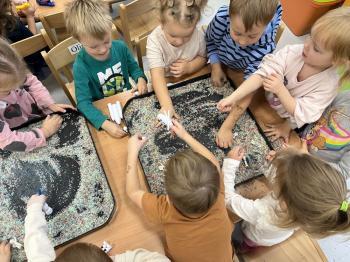 Za sprawą kolorowego, błyszczącego ryżu dzieci przeniosły się w magiczny świat planet, gwiazd i galaktyk. Każdy miał okazję tworzyć swój własny kosmiczny krajobraz, przesypywać, mieszać i odkrywać nieskończone możliwości zabawy sensorycznej.