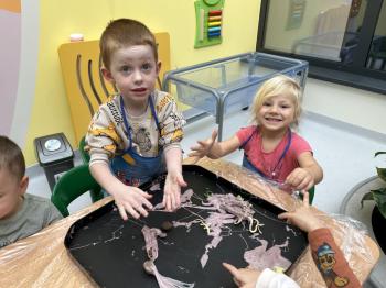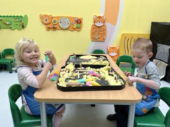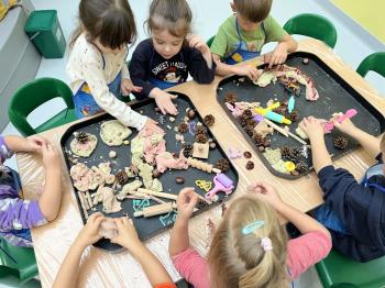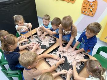 W ramach obchodów Dnia Pluszowego Misia dzieci stworzyły dla swoich pluszaków wyjątkową, barwną przestrzeń do zabawy. Na zajęciach pojawiła się również masa ziemniaczana, która zachwyciła dzieci miękką konsystencją i możliwościami formowania. Na zakończenie sensorycznej przygody przedszkolaki mogły poczuć cytrusowy zapach ciastoliny, który wprowadził w sali świeżość i poprawił wszystkim nastrój.