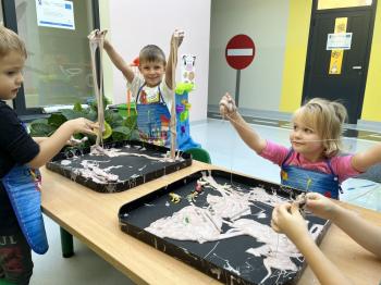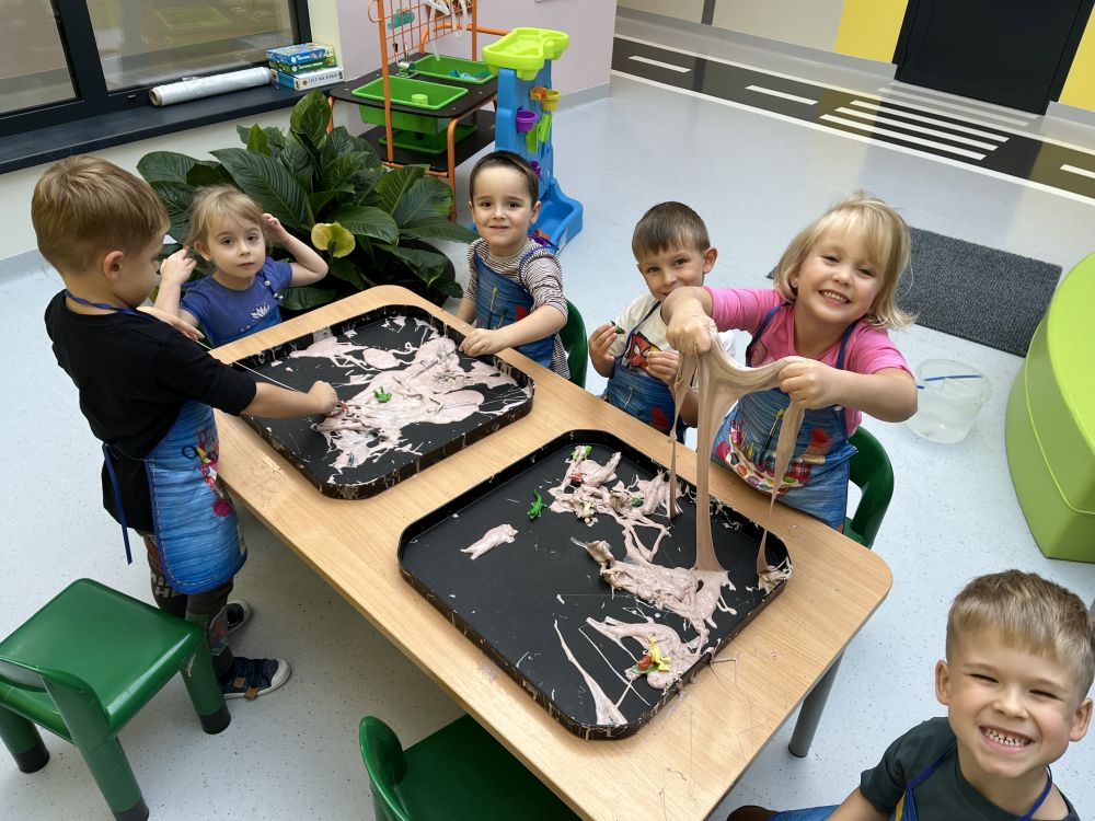 Kolejne zadanie budziło ogromne emocje – poznaliśmy Slime, czyli masę o wyjątkowo rozciągliwej i elastycznej konsystencji. Dzieci z zaangażowaniem sprawdzały, jak daleko można go rozciągnąć, ugniatać i formować, ćwicząc tym samym wrażliwość dotykową oraz cierpliwość.