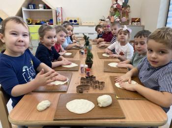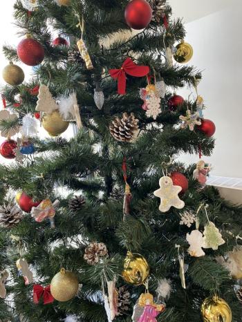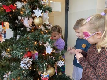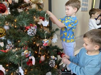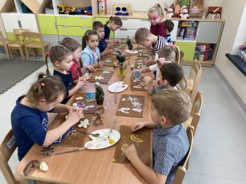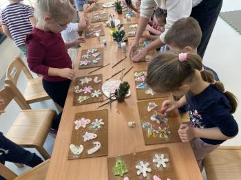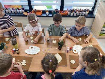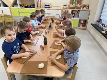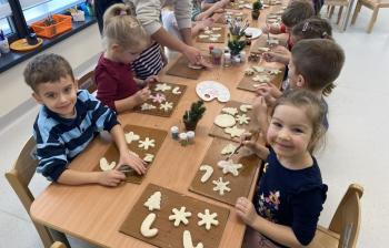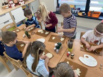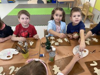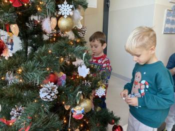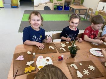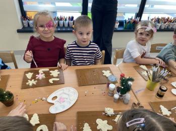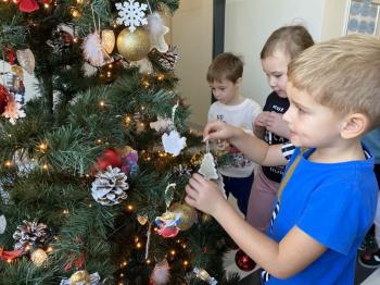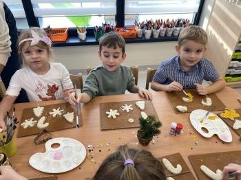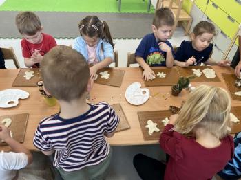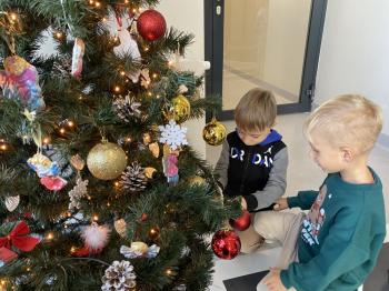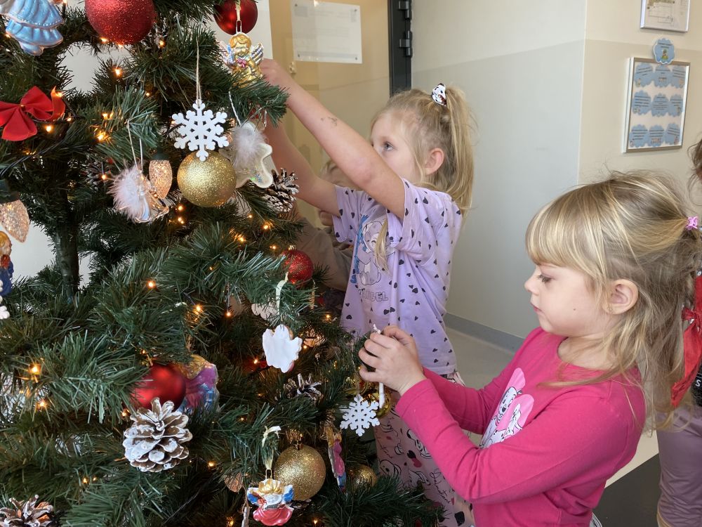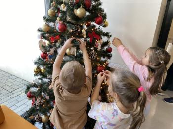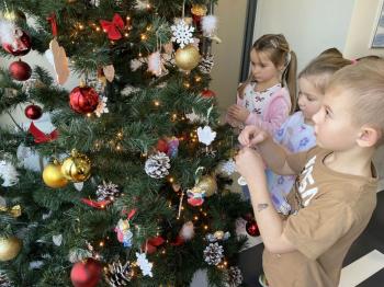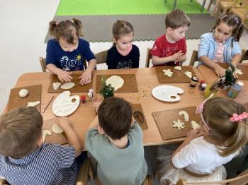 W grupie „Jeżyki” zapanował świąteczny nastrój. Dzieci wykonały zawieszki na choinkę z masy solnej, a następnie ozdobiły je farbami oraz brokatem. Na zakończenie wszyscy wspólnie udali się udekorować choinkę przedszkolną, tworząc radosną i świąteczną atmosferę.