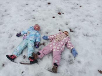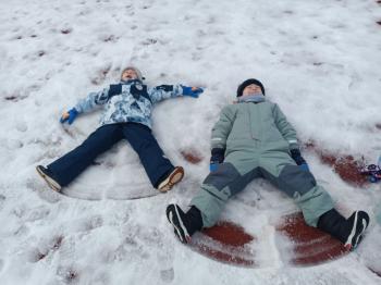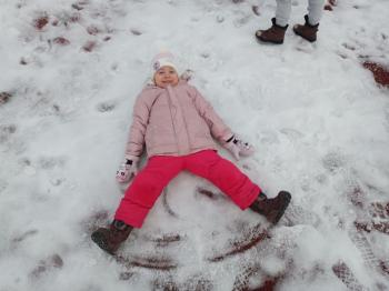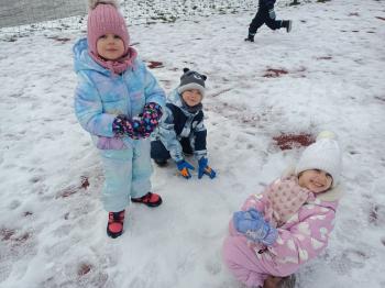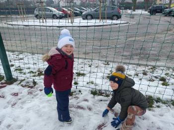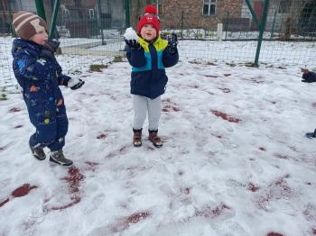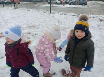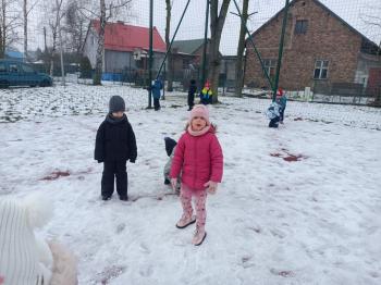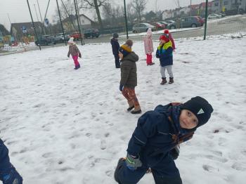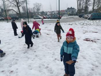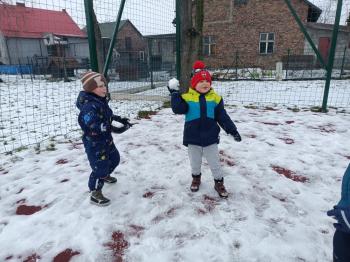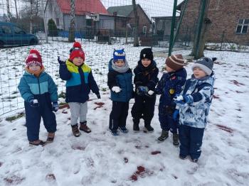 Korzystając z uroków zimy przedszkolaki z grupy Rybek bawiły się wspólnie na śniegu. Dzieci lepiły kule śniegowe, rzucały śnieżkami oraz odbijały na śniegu „aniołki”. Zimowemu pobytowi na świeżym powietrzu towarzyszyły również zabawy ruchowe: Taniec pingwinów oraz zamarzanie. Wszyscy doskonale się bawili wykorzystując walory pobytu na świeżym powietrzu.