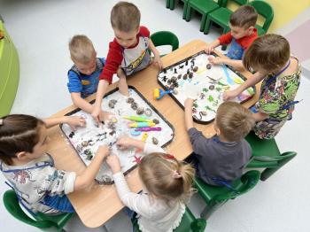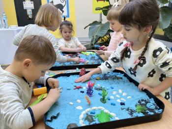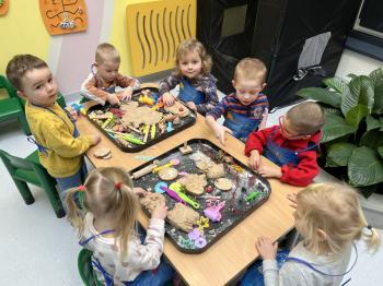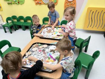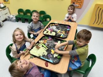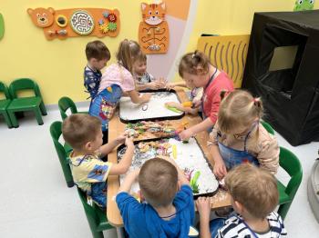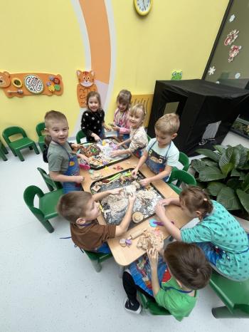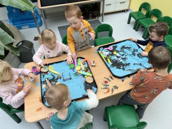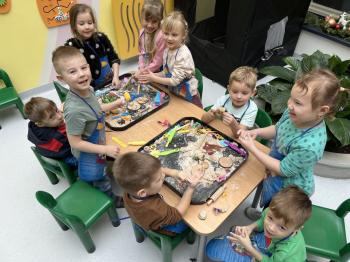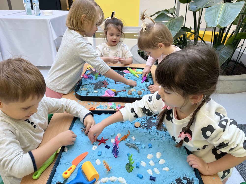 Nie zabrakło także fascynującej wyprawy do lodowej krainy dinozaurów, gdzie zabawa łączyła się z elementami odkrywania i swobodnej eksploracji. Kolejnym sensorycznym przystankiem była masa z kaszy manny – mannolina, która pozwoliła dzieciom ugniatać, formować, wałkować i rozwijać sprawność dłoni oraz koordynację ruchową.