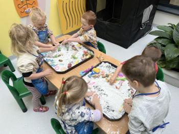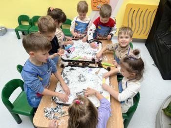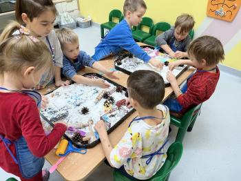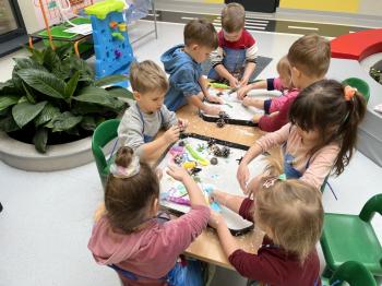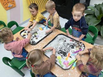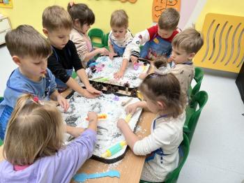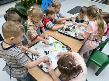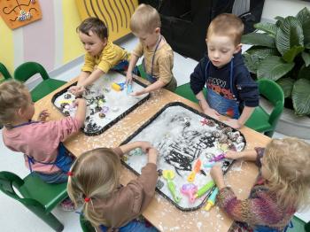 Dzieci poznawały kolory zimy — biel, błękit i srebro, obserwując ich połączenia i ucząc się rozróżniania barw poprzez dotyk i wzrok. Szczególną radość sprawiło im magiczne śnieżne doświadczenie, gdy każdy mógł poczuć „śnieg” w swojej dłoni i sprawdzić, jak zmienia się pod wpływem dotyku.