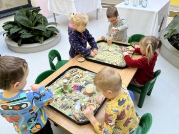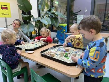 Podczas zajęć dzieci miały również możliwość kontaktu z materiałami sypkimi, które mogły przesypywać na różne sposoby, obserwując dźwięki, ruch i strukturę. Te proste, a jednocześnie niezwykle bogate doświadczenia wspierały rozwój motoryki małej, koncentracji oraz naturalnej ciekawości świata.