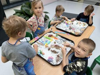 Styczeń w naszych projektowych grupach upłynął pod znakiem sensorycznej podróży pełnej zimowych doznań i twórczych odkryć. Dzieci miały okazję doświadczać świata wszystkimi zmysłami, eksperymentować, badać faktury, zapachy i kolory, a przede wszystkim — uczyć się poprzez zabawę.