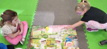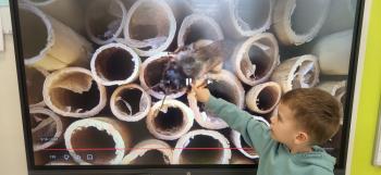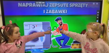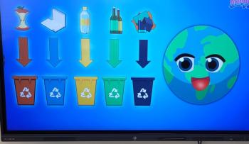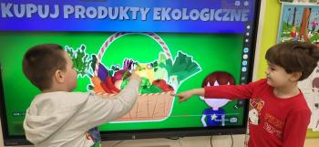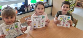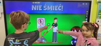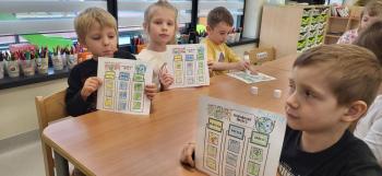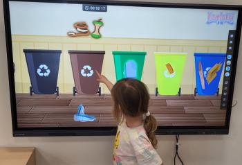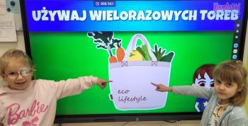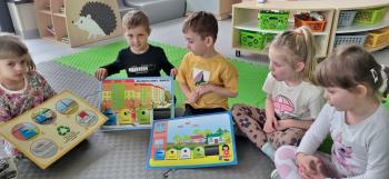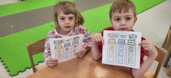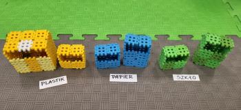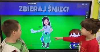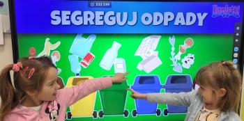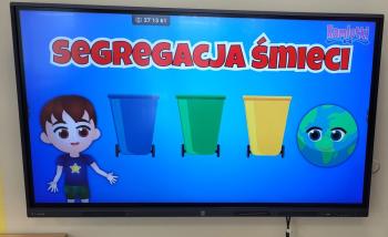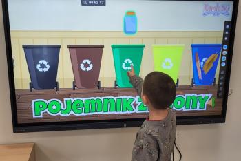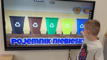 Temat drugi obejmował zagadnienia: po co segregujemy odpady, zapoznanie ze znaczeniem kolorowych pojemników, wprowadzono zasady małego ekologa.