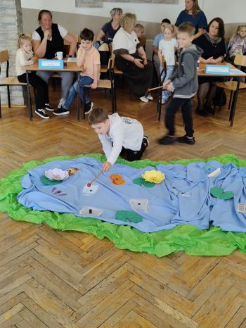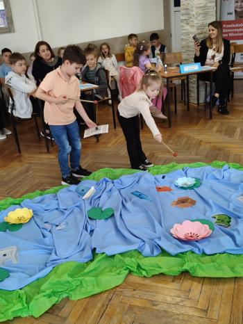 Przenoszenie kropelek wody przy pomocy rurek do picia, wykonywanie eksperymentu z kolorowym deszczem, tworzenie plakatu pt. „Obieg wody w przyrodzie”, stworzenie pracy plastycznej pt. „Kropelkowa woda”, oczyszczanie stawu – to tylko kilka zadań jakie miały do wykonania dzieci w trakcie rywalizacji konkursowej. Za każde poprawnie wykonane zadanie, przedszkolaki otrzymywały punkty i naklejały je na specjalną planszę. Każdą z konkurencji oceniała również komisja konkursowa w składzie: