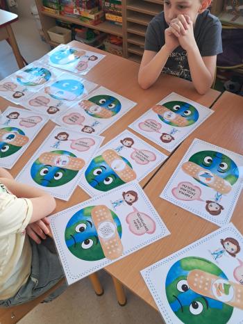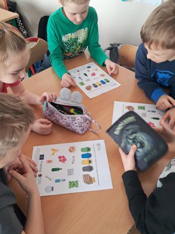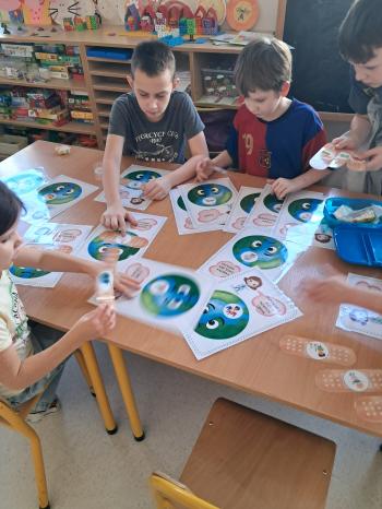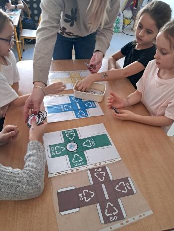 Dzieci zapoznały się z pojęciem „recyklingu”, a także rozmawiały o właściwej segregacji odpadów oraz ich przetwarzaniu czyli właśnie o recyklingu. Uczniowie uzupełniali karty pracy np.: ekologiczne wykreślanki, rozsypanki. Ponadto uczniowie w grupach wykonywali takie zadania jak np.: segregacja śmieci- łączyli odpady z odpowiednimi koszami, wyszukiwali sposoby uzdrowienia Ziemi z zalegających śmieci, a także wskazywali działania, które miały poprawić jakość i czystość Ziemi. Z wszystkich zadań uczniowie wywiązali się bardzo dobrze prezentując dużą wiedzę ekologiczną. Wspólnie wykonaliśmy szkolną gazetkę.